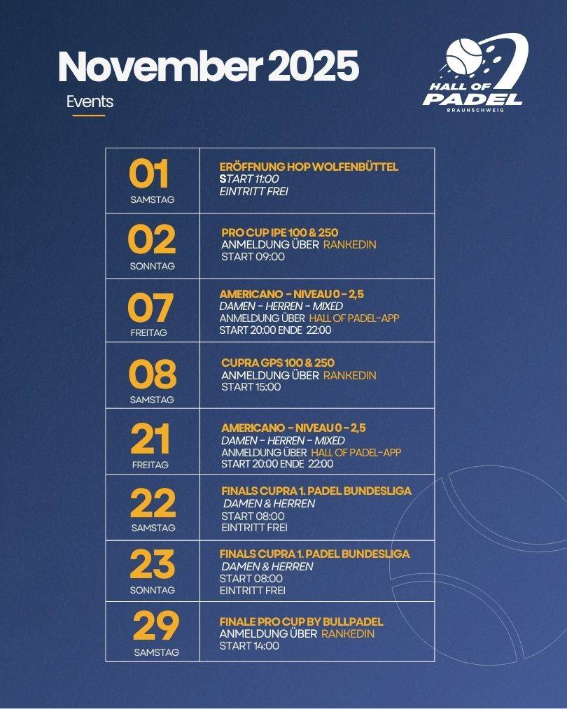 Und dann das große Finale: 🏆 22. & 23.11. – FINALS CUPRA 1. PADEL BUNDESLIGA in BRAUNSCHWEIG! Die besten Teams Deutschlands kämpfen um den Titel – Emotion, Energie & Spitzen-Padel pur! 💪